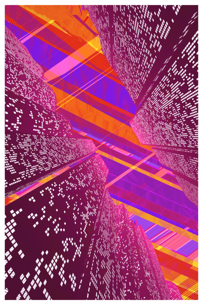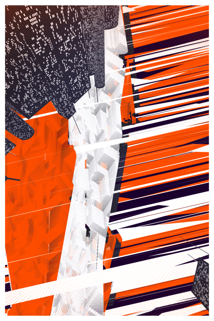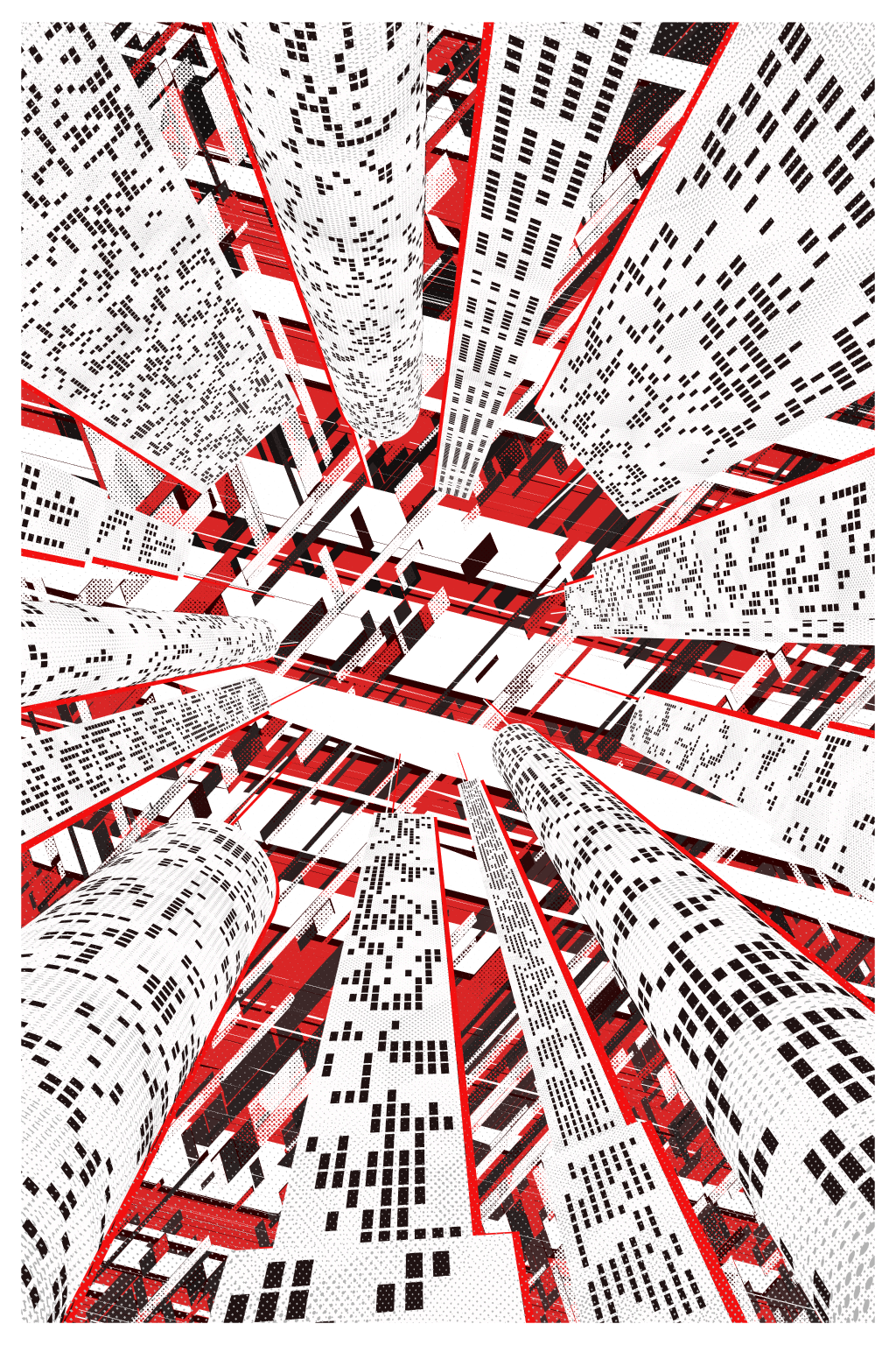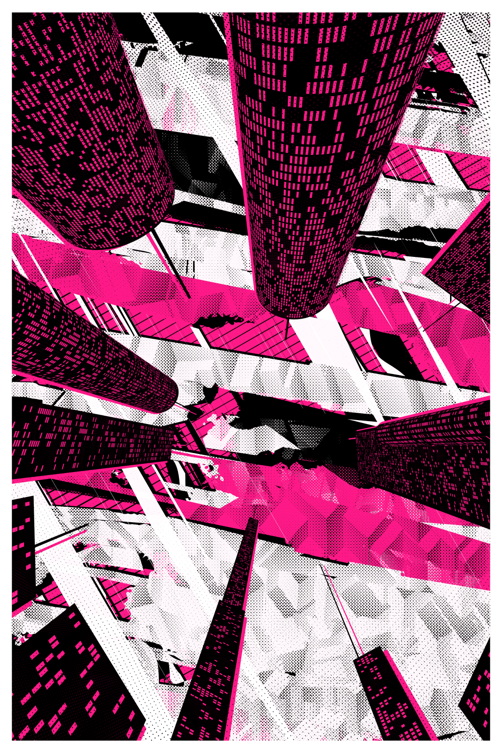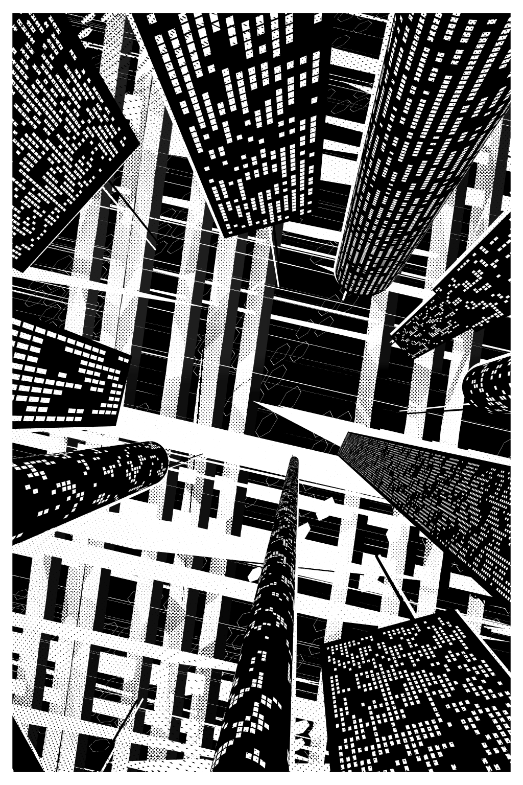 A semi-abstract semi-figurative look at the city, either a cage or an ocean of possibilities, under a future sky that alternately oppresses and inspires.