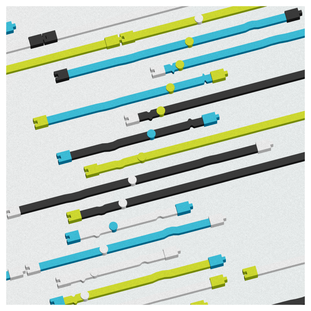 I started playing with the dimensions, the opened/closed state of the connectors and started seeing some generative stuff happening. I switched to an orthographic camera to focus on the parallel aspect of the lines, played with shadows and camera angles, saw interesting stuff and decided this would be my next project.
