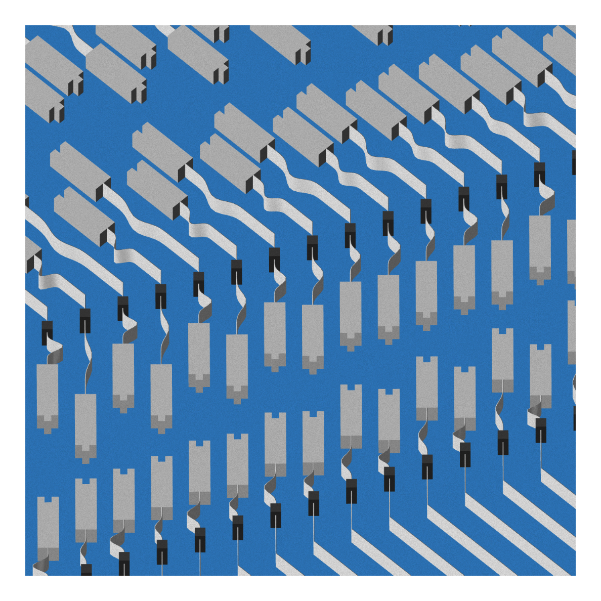 I had bit of fun with the 7-segment display, but otherwise the structure is there : connectors on lines that curve at certains angles, with little separators peppered along the way. Then the lines are stacked at an angle. Except already, there’s more than that : there’s two types of lines alternating, with the connectors alignements and the behaviour when opening changing, and some occasionnal overlap.